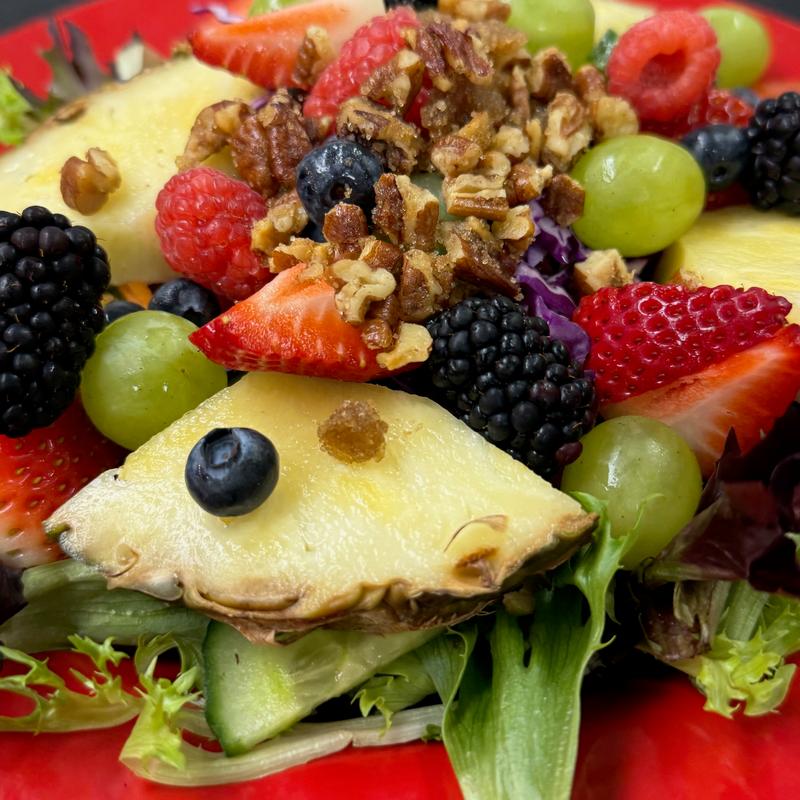 Chef's spring mix, feta cheese, roasted pecans, and fresh seasonal fruit. Served with your choice of dressing
