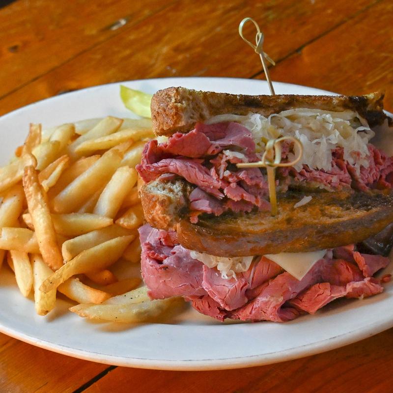 A generous serving of Boar's Head corned beef, sauerkraut, Swiss cheese, Thousand Island dressing, all layered on hearty rye bread