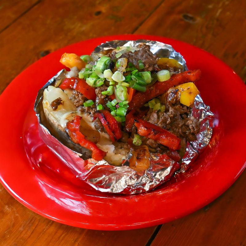 Our Philly Cheese Steak Sandwich (minus the bread of course) stuffed into a baked potato