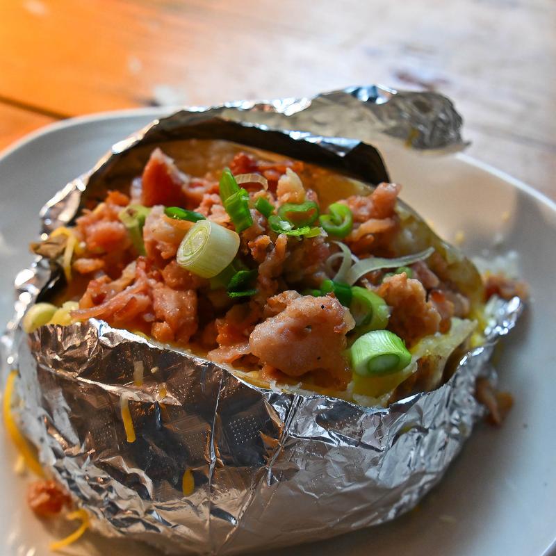 A baked potato stuffed with cheese, scallions, Boar's Head bacon, butter, sour cream, and BBQ chicken