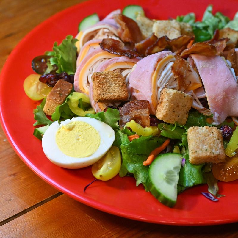 Chef's spring mix topped with rolled Boar's Head ham, turkey, bacon, provolone and cheddar cheese, tomato, cucumbers, boiled egg, dried cranberries, banana peppers and house croutons. Served with your choice of dressing
