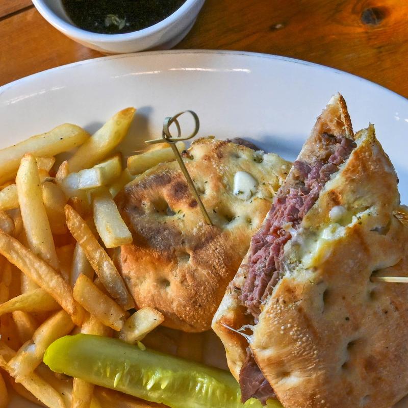 Roast beef with provolone & pepper jack cheeses, sautéed mushrooms, caramelized onions and horseradish cream sauce. Served on Italian bread with au jus